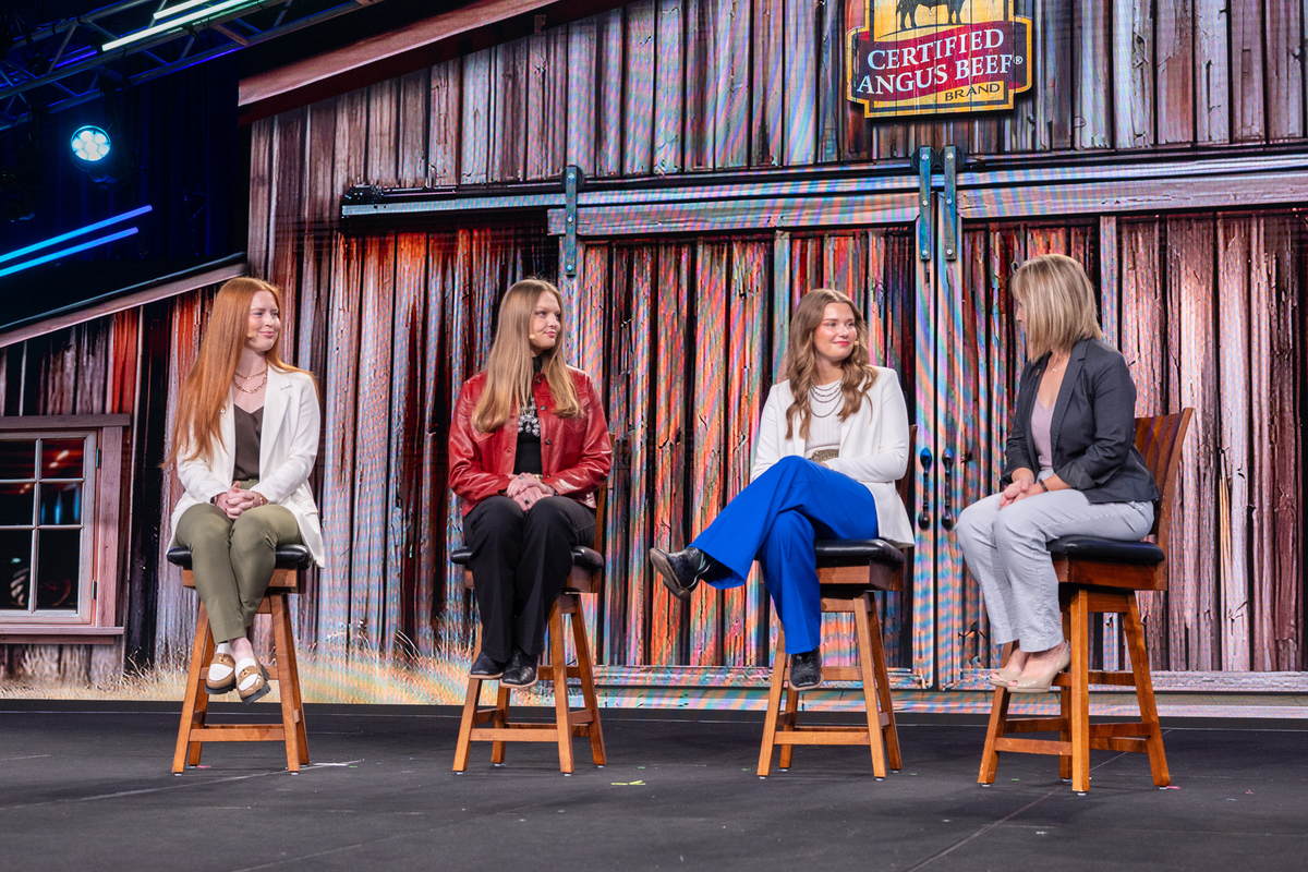 2025 Colvin Scholarship recipients, Lindsey Decker, Texas Tech University; Lauren Wolter, Kansas State University; and Olivia Hadrick, South Dakota State University sharing their academic interests with Melissa Brewer, Certified Angus Beef vice president of communications, at the 2025 Certified Angus Beef Annual Conference in Austin, Texas.